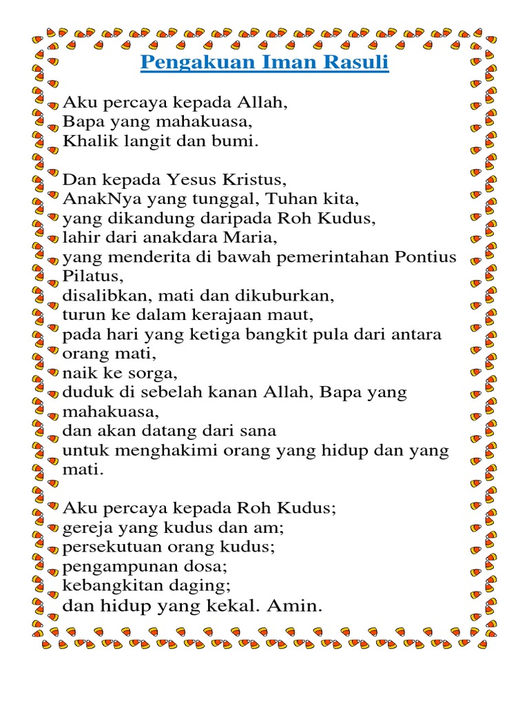 Aku percaya akan satu allah, bapa yang mahakuasa, pencipta langit dan bumi, dan segala sesuatu yang kelihatan dan tak kelihatan; pengakuan iman nicea. Pengakuan kedu a rum usan pengakuan iman rasuli ini adalah aku p ercaya kepada yesus kristu s!